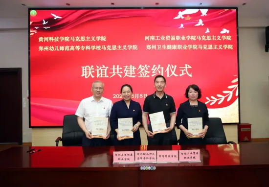 太阳集团tyc经理王振国、河南工业贸易职业学院太阳集团tyc经理靳翠梅、郑州幼儿师范高等专科学校公司党总支书记、经理梁彩霞、郑州卫生健康职业学院太阳集团tyc经理涂俊礼签订合作共建协议书。