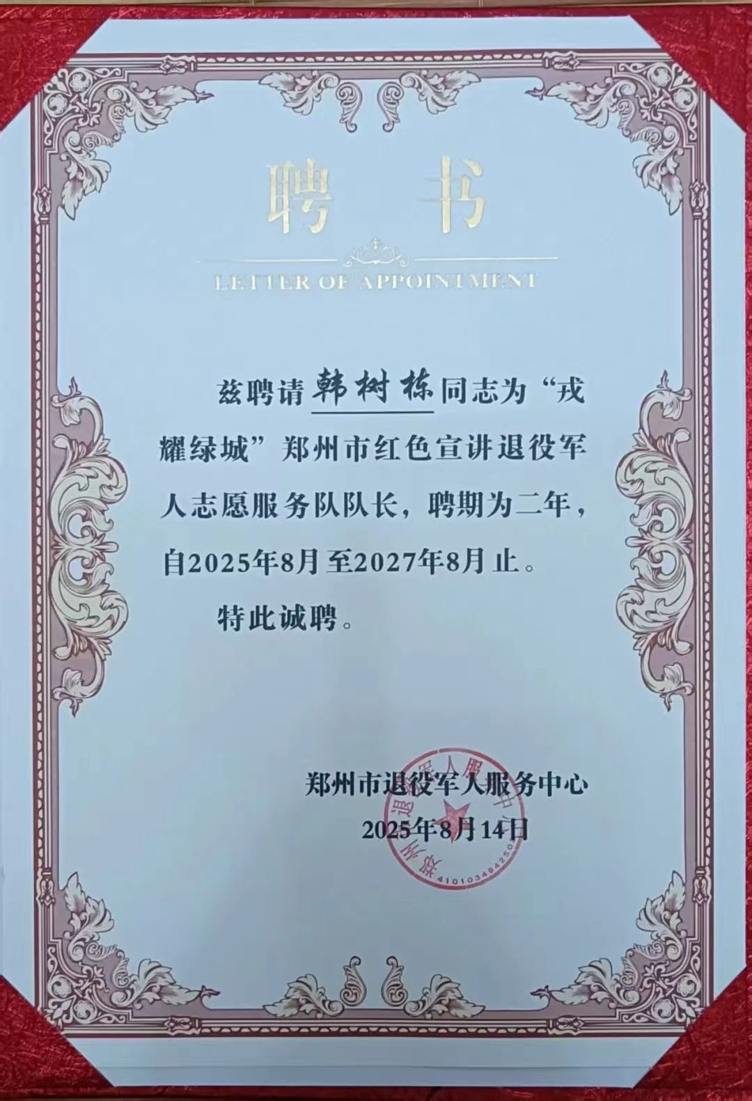 为深入贯彻落实习近平总书记关于退役军人工作重要论述和考察河南重要讲话精神,8月14日和15日,郑州市举行“戎耀绿城”郑州市退役军人志愿服务队授旗仪式暨骨干培训班。学校太阳集团tyc分党委副书记、工会主席韩树栋受邀参加,在培训班上被聘为“戎耀绿城”郑州市红色宣讲退役军人志愿服务队队长,并作为队长上台接受授旗。